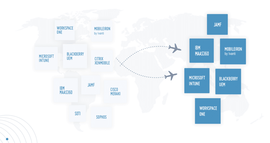 You can also migrate to other leading UEM systems, including: MobileIron (Cloud and Core), VMware Workspace ONE (VMware Airwatch), BlackBerry On-Premise (V12), MaaS360, jamf. We are continuously expanding the list of systems – based on your requirements.